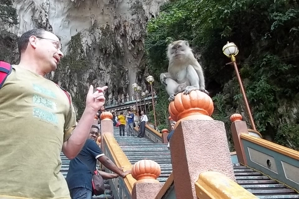 Digitalkamera 10,- Filmkamera 20,- alles zusammen 70,- Ringits und da ging die Videokamero als Fotoapparat durch. Rucksack muß eingeschlossen werden dann kann es auf Pirsch gehen. Plötzlich raschelt es über uns und ein erster Rotmaulaffe zeigt sich im Geäst und schwingt sich von Ast zu Ast. Kamera hat ihn, für den Fotoapperat war er zu schnell. Nach ca 800m erreicht man die Futterstelle, zu der die noch nicht ganz ausgewilderten Orangs pktl. zur Fütterungszeit 10.00 Uhr und 15.00 Uhr manchmal zurückkommen. Und siehe da ein Neuzugang wollte sicher gar nichts verpassen und schlief gleich an der Futterstelle. Langsam füllte sich der Beobachtungsplatz mit neugierigen Orang Orangs (das ist die malaische bez. für Homo sapiens) und gegen 9.50 Uhr kam Bewegung in unseren Freund. Ringsum den Beobachtungsplatz fing es jetzt auf allen seiten an zu rascheln und überall kamen hungrige Makaken durch die Wipfel geschwungen, Der größte traute sich zur Fütterungsstelle vor und baute sich drohend vor dem Orang auf, der langte ihm kurzerhand eine, das der Angreifer fast vom 3m hohen Futterplatz gefegt wurde. Aber das schien den Makakenführer nur noch wütender zu machen und der bleckte die Zähne und schrie auf den Orang Utan ein, das dieser schließlich davonhangelte. Nun setzte erst recht wildes Treiben ein. Aus allen Himmelsrichtungen kam die ganze Horde groß und klein und balgte sich um einen vorderen Platz an der Futterstelle. Nun setzte auch noch tropischer Regen ein, die Tropfen wurden immer größer und wir mußten die Kameras unter den T-Shirts vorm Nasswerden schützen. Die Pfleger kippten auch nur schnell ihre Bananeneimer leer und verliesen die Futterstelle. Die Makaken dagegen störte der Regen sichtlich überhaupt nicht und räumten in blitzesschnelle die Bananen ab so das an diesem Tag kein Orang auch nur eine Banane abbekam: Dschungelgesetz. Uns wurde der Regen jetzt auch zu stark und wir setzten den Rundweg nun im Schnellschritt fort um wieder ein Dach über den Kopf zu bekommen.